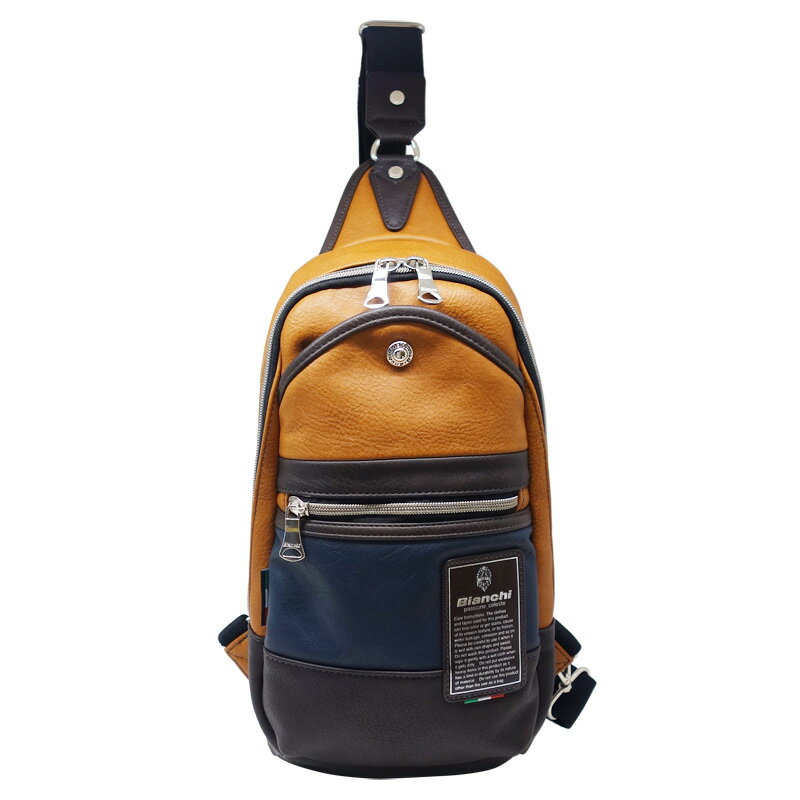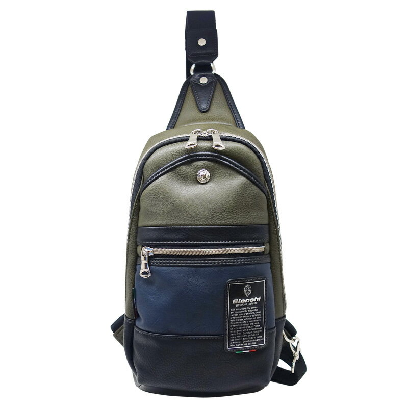 フェイクレザーにビアンキのロゴがあしらわれた付属パーツが高級感漂う仕上がりのボディバッグ。