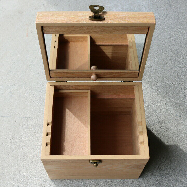 商品名 ナチュラリー コスメボックス ワイド サイズ 本体:約24×22×25cm(ハンドル、金具含む) ミラーサイズ:約12.5×21.5cm トレー内寸:約8.5×16.5×2cm 材質 MDFつき板・亜鉛合金・ミラー 使用上の注意 ●丸い金具部分は衝撃に弱いため、開閉時などお取扱いにご注意ください。