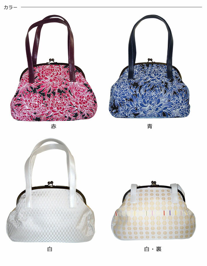 サイズ 縦:約21cm 横:約34cm(最大) マチ:約11cm 持ち手長さ:約20cm 開口部:約20cm(最大) 素材 表生地:絹 100% 裏生地:レーヨン 100% 持ち手:合成皮革 口金:鉄 仕様 企画・生産:日本 インナーポケット:1つ コメント ・シルク生地で作ったがま口バッグです! ・生地は綿ではなく、当店のバッグはシルクを使っているので見た目も手触りも違います! ・がま口も簡単に開け閉めできるようになっています! ・持ち手には合成皮革を使っているので、長時間手に持っても肩に掛けても痛くなりにくいです! ・色は、青・赤・白の3色展開! ・白は表と裏で柄が違います! ・洋服でもお着物でもどちらでもお使い頂けます! ・普段使いとしてもおススメです! ・あると便利なインナーポケット付きです! ご購入上のご注意 ・当店ではギフト配送・ラッピングサービスは行っておりませんので、予めご了承下さい。